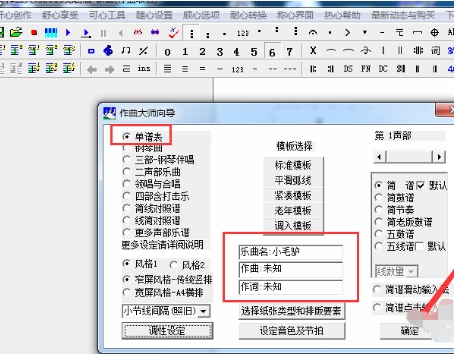 1. 启动软件选择谱表模板,输入作品基础信息。以经典儿歌改编为例,在向导界面选择单行谱表,填写作品名称与创作者信息后进入编辑界面