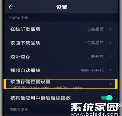 3. 进入设置界面后,向下滑动找到【存储位置设置】分类。点击该选项即可查看当前下载歌曲的完整目录路径,系统默认存储位置通常为手机内置存储的「QQMusic」文件夹内。用户亦可在此手动切换至SD卡或其他自定义路径。