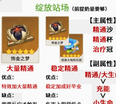 绽放特化型:元素精通沙漏 元素精通杯 治疗增幅头冠(建议保留基础生存能力)