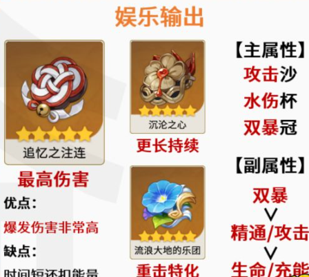 输出倾向:双暴属性>元素精通/攻击加成>生存属性