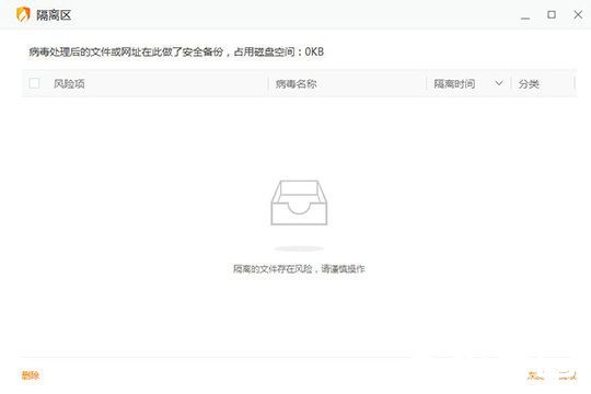 完成扫描后,所有被处理的潜在风险文件都会集中存储在隔离区。通过主界面左下角的"安全日志"可查看具体处理记录,点击"查看详情"即可跳转至隔离区管理界面。该界面采用表格形式清晰展示文件名称、威胁类型、处理时间等关键信息,顶部状态栏实时显示存储空间占用情况。