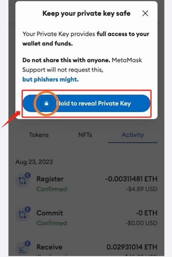 5、进入私钥展示界面后,系统会要求长按指定区域进行生物识别验证。完成指纹或面容ID核验后,完整的私钥字符串将以星号遮蔽形式呈现。