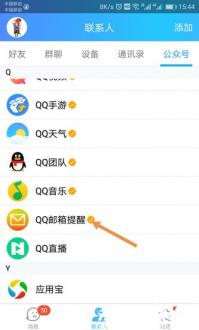在公众号检索界面,顶部设有字母索引导航栏。轻触字母「Q」可快速筛选出相关服务,此时在列表中找到带有蓝色认证标识的「QQ邮箱提醒」官方账号,该账号图标为经典信封造型设计。