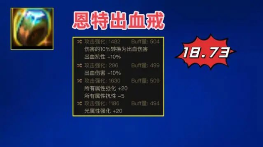 1.恩特精灵戒指组合(出血转伤10%+双属强)提供18.73%基础增幅与转伤特效
