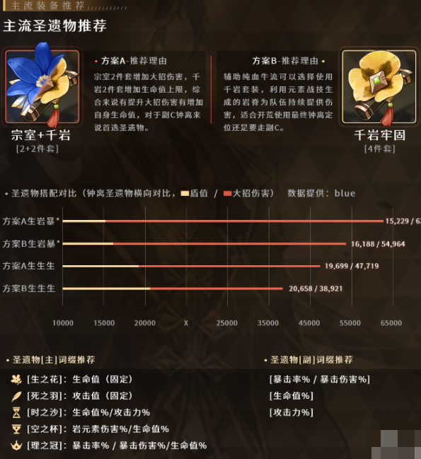 词条选择方面,时之沙建议固定选择生命值主属性,空之杯可根据流派在岩伤加成/生命值之间灵活调整。理之冠的首选属性为暴击率或暴击伤害,当暴击面板达标后(建议60%/120%以上),可替换为生命值主词条以强化护盾效果。